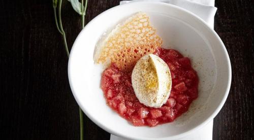 В это время удалите из маринада имбирь. До кипения ревеневую массу доведите. Сразу снимите с огня и откиньте ревень на сито. Получившийся сироп верните в кастрюлю. Сразу смешайте с крахмалом, разведенным в небольшом количестве холодной воды. Перемешайте до однородности. Ревень переложите в миску и смешайте с получившейся киселеобразной смесью. Для подачи разложите ревеневую массу по мисочкам или креманкам, добавьте кнель из Камы и украсьте чипсом из блинного теста. Сразу подавайте.