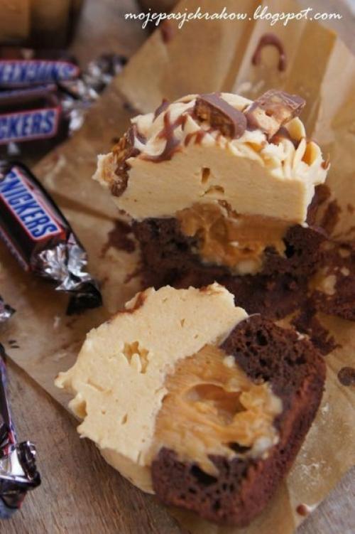 Поставить в разогретую духовку и выпекать около 25 минут при температуре 200 градусов. После выпечки оставить в форме в течение 10 минут, затем осторожно достать и остудить полностью. Для начинки, крупно нарезать орехи и тщательно перемешать с карамелью. Для карамели, поместить сахар в кастрюлю, желательно с толстым дном. Нагреть, пока он не расплавится и не станет темно - янтарного цвета. До тех пор, пока сахар не смешивать! В качестве альтернативы, вы можете встряхнуть кастрюлю, если это необходимо. Когда вы видите что появляются пузыри влить сливки. Перемешать, пока весь сахар не растворится. Когда масса немного остынет, чтобы добавить разломанный шоколад и масло. Перемешать до однородной массы. В том случае, если масса остынет и слишком загустеет, немного нагреть. Взбить, чтобы объединить ингредиенты. Арахисовое масло, вы можете приготовить самостоятельно, для этого измельчить очищенный арахис с небольшим количеством растительного масла, щепоткой соли и небольшим количеством сахара. Воду, 2/3 стакана сахара и инвертный сироп поместить в кастрюлю с толстым дном помешивая. Довести до температуры около 115 с ( "Мягкий Шарик" - то есть капля сиропа упавшая в стакан ледяной воды превратится в мягкий шарик. Мы врем приготовления приблизительно 6 мин. В это время белки до жестких пиков взбить. В конце сбивания, добавить 2 столовые ложки сахара и взбить. Когда сироп готов, и белки взбиты, медленно влить в белки, не прерывая взбивания сахарный сироп. Взбить массу около 5 минут, пока она не станет густой и глянцевой. Затем добавить ванильный экстракт и смешать еще около 1-2 минут. Полученный таким образом крем переложить в герметичную банку и хранить в холодильнике до двух недель. Для крема, взбить размягченное сливочное масло с сахарной пудрой до воздушной массы (по крайней мере, в течение нескольких минут. Взбивая медленно добавить арахисовое масло. Затем крем маршмеллоу, сливки и ванильный экстракт. Крем должен быть гладким. В каждом кексе вырезать середину, чтобы сделать углубление, заполнить карамельно - ореховой начинкой. Крем переложить в кондитерский мешок и украсить верхнюю часть капкейков. Шоколад на водяной бане растопить. Тонкой струйкой полить каждый кекс. Украсить нарезанными на кусочки сникерсами. Приятного аппетита!