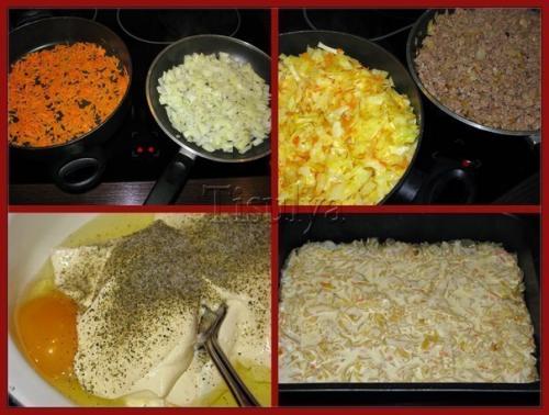 В одной сковородке на растительном масле обжарить лук, в другой морковь. К луку добавить фарш, посолить, поперчить, жарить 15-20 минут. К моркови добавить капусту, немного посолить, тушить под крышкой до готовности (около 15-20 минут.