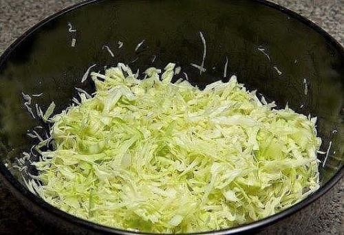 Шаг 1 капусту нашинковать, как можно мельче, посыпать солью и помять руками, чтобы она стала мягкой и пустила сок.