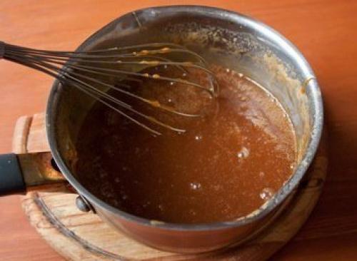 Мы кладем сахар в ковшик с толстым дном. Ставим на средний огонь. Постоянно помешивая, доводим до кипения. Варим до тех пор, пока сахар не растворится и масса не станет янтарного цвета.
