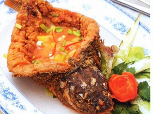 Обвалять рыбу в муке. В глубокой сковороде разогреть масло, жарить рыбу во фритюре в течение 15 минут, затем выложить на плоскую тарелку.