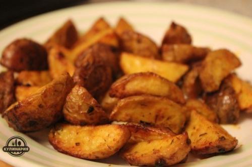 Слейте воду с картофельных долек, смешайте их с маринадом из специй и масла, дайте немного постоять. На чистый сухой противень выложите дольки кожурой вниз и уберите в разогретую до 200 градусов духовку на 20-30 минут. Приятного аппетита!