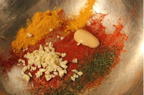 Теперь мы смешаем специи. В традиционном рецепте присутствуют лишь укроп, соль, чеснок, паприка и оливковое масло, но я добавляю еще Карри и куркуму, так вкус становится гораздо ярче, а запах - просто потрясающий. Чеснок мелко нарежьте и смешайте с остальными специями, добавьте 3 столовых ложки оливкового масла, перемешайте.