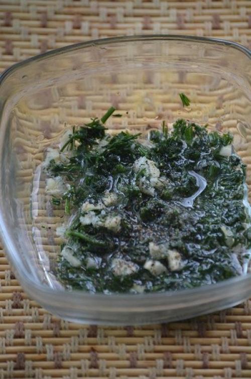 2. приготовить соус: веточки укропа и чеснок мелко измельчить. Добавить соль, перец и растительное масло.