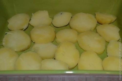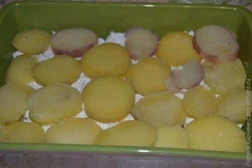 4. теперь нужно подготовить форму, в которой мы будем готовить наш картофель "По-княжески", и слегка смазать ее растительным маслом. На дно формы выкладываем наши картофельные колечки, немного присолив.