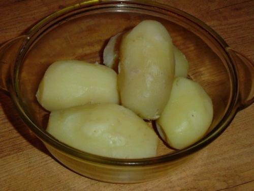 5. картофель разрезать пополам, удалить мякоть и порезать ее кубиками.