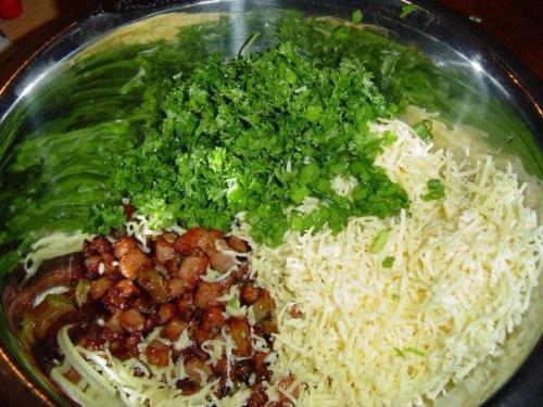 4. обжаренную ветчину и лук смешать с петрушкой, зеленоватым луком и сыром.