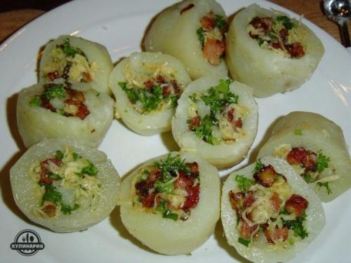 8. заполняем половинки картошки приобретенным фаршем, объединяем половинки, обваливаем их в пытке, яичке, и вновь в пытке. Обжариваем во фритюре до золотистого цвета. Получаем нежную картошку в хрустящей панировке. Приятного аппетита!