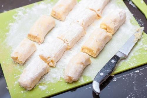 6. картофельную массу скатать в колбаски на подпыленном мукой столе и нарезать на одинаковые брусочки.