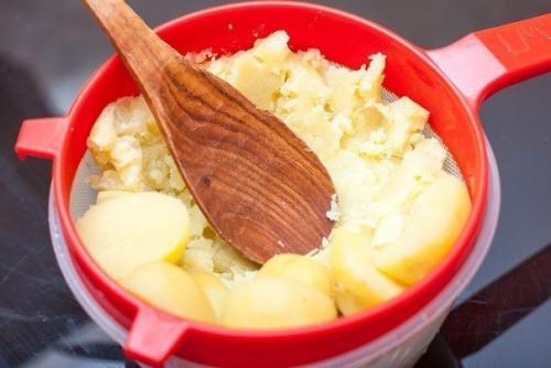 1. картофель очистить, отварить в подсоленной воде до готовности, затем воду слить, крышку с кастрюли снять и оставить картофель на 10 минут, чтобы подсох. Поверхность должна побелеть. Затем протереть картофель через сито.