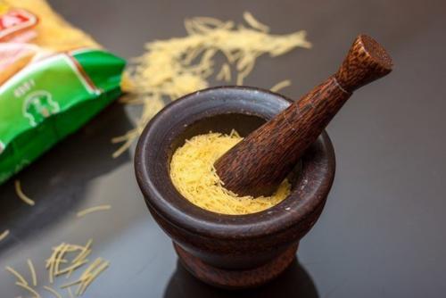 5. мелкую яичную вермишель истолочь в ступке или положить в пакет и прокатить по нему несколько раз скалкой.