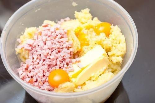 3. в пюре добавить 3 желтка, сл. Масло, мускатный орех, соль и нарезанную ветчину. Перемешать.