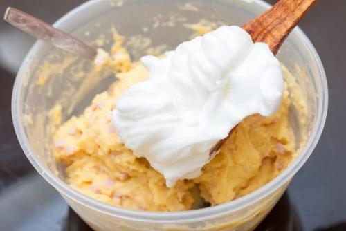 4. белки разделить пополам, одну часть взбить в крепкую пену и добавить к пюре, вмешивать аккуратно, снизу вверх.