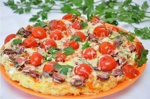 700 г очищенного картофеля, 2 яйца, 2 ст. Ложки муки, 3-4 зубчика чеснока, соль, перец, 3 ст. Ложки сметаны, 1 ч. ложка с Горкой дижонской горчицы, 200-250 г копченых охотничьих колбасок, 2 средние головки репчатого лука, 1 сладкий болгарский перец, 150 г помидоров Черри, 170 г твердого сыра, несколько перьев зеленого лука, растительное масло для обжарки.