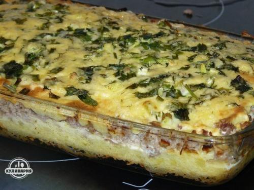 - 5-6 Картофелин, - 500 грамм фарша, - луковица, - 3 яйца, - немного сыра, - свежая зелень.