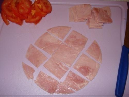 4. в картошку в каждый надрез чередуя положить кусочек ветчины и помидора. Затем посолить и поперчить.