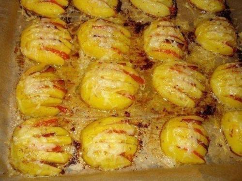 1. картофель очистить, помыть, разрезать пополам, затем разрезать поперёк на тонкие ломтики, но не до конца, чтобы картофель внешне казался целым.