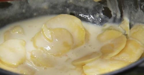 1. мы очищаем картофель. Нарезаем кружочками. Отправляем в горячее молоко. Солим и варим на медленном огне, постоянно помешивая.