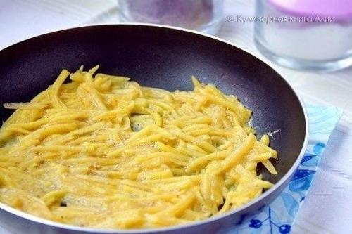 На сковороду выкладываем как блинчик, т. е по всему диаметру сковороды.