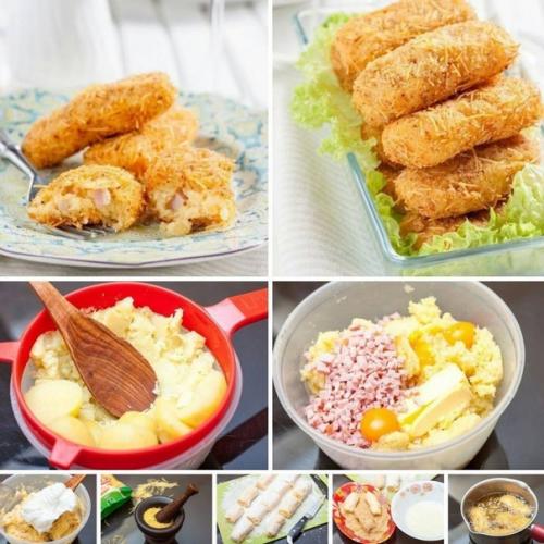 3. в пюре добавить 3 желтка, сл. Масло, мускатный орех, соль и нарезанную ветчину. Перемешать.