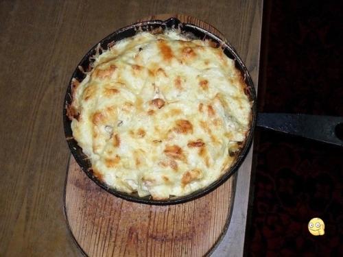 Сыр выкладываем сверху на картошку таким образом, чтобы он образовал шубку и чтобы под ним не было видно ничего, ведь именно сыр придает этому блюду особой изюминки.
