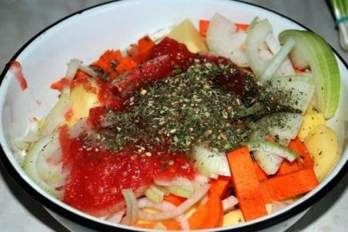 Просто, полезно и вкусно. Редко встречающиеся вместе понятия. Обычно, если вкусно, то не полезно и не просто, если просто, то, как минимум не вкусно. Но, здесь у нас все гармонично и хорошо. Итак, нам надо - 1 кг. Картофеля, 1 морковка, 1 помидорчик, лучок, немного специй для картошки или тех, что вам нравятся, пучок зелени и несколько зубчиков чеснока. Можно лук. 1 ст. Ложка растительного масле.