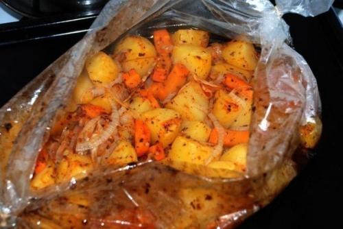 Картошку чистим и режем кубиками. Морковку режем брусочками. Лук - полукольцами. Все смешиваем, посыпаем специями, добавляем столовую ложки растительного масла, натертый на терке помидор, и еще раз тщательно перемешиваем. Помещаем нашу смесь в рукав для запекания и на противне в духовку, прогретую до 180 градусов на 1, 5 часа. Вытягиваем картошку. Пересыпаем в кастрюлю или миску, добавляем мелкопорубленный или выдавленный через чеснокодавку чеснок и измельченную зелень. Аккуратно перемешиваем и закрываем сверху пленкой. Даем настояться 3-5 минут. Вот и все. Можно насыпать кушать и радоваться, что всего на 1 ложке масла была приготовлена такая гора картошечки и при этом не надо было ни перемешивать ни волноваться, что что-то подгорит.