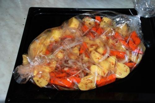 Картошку чистим и режем кубиками. Морковку режем брусочками. Лук - полукольцами. Все смешиваем, посыпаем специями, добавляем столовую ложки растительного масла, натертый на терке помидор, и еще раз тщательно перемешиваем. Помещаем нашу смесь в рукав для запекания и на противне в духовку, прогретую до 180 градусов на 1, 5 часа. Вытягиваем картошку. Пересыпаем в кастрюлю или миску, добавляем мелкопорубленный или выдавленный через чеснокодавку чеснок и измельченную зелень. Аккуратно перемешиваем и закрываем сверху пленкой. Даем настояться 3-5 минут. Вот и все. Можно насыпать кушать и радоваться, что всего на 1 ложке масла была приготовлена такая гора картошечки и при этом не надо было ни перемешивать ни волноваться, что что-то подгорит.