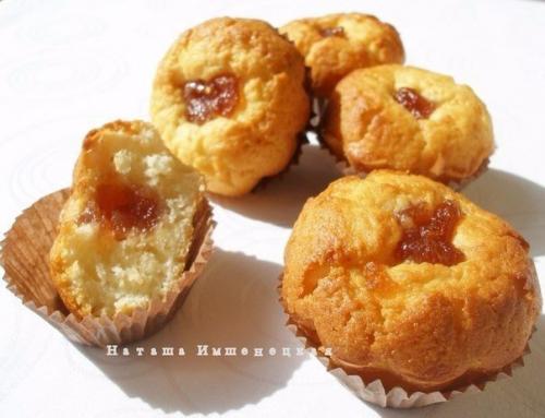 Тесто по формочкам разложить. В середину каждой положить по 0, 5 чайной ложке джема (из этого количества теста получается 12 кексов. Выпекать кексики на кефире 20 минут при температуре 180 градусов.