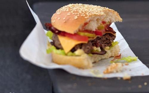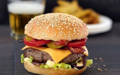 5. разрежьте булочки пополам. Смажьте нижние половинки майонезом, а верхние - кетчупом. Разложите нарезанные листья салата на нижние половинки булочек, сверху положите обжаренный лук, на него котлеты, а затем по ломтику чеддера, нарезанные помидоры и огурцы. Накройте все верхними половинками булочек и сразу можете есть.