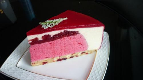 Пошаговое фото рецепта: клюквенный торт "Огонь Рождественской Свечи" 23. Достать торт из морозилки вынуть из формы (я не очень аккуратно это сделала, бока не идеально ровные получились).