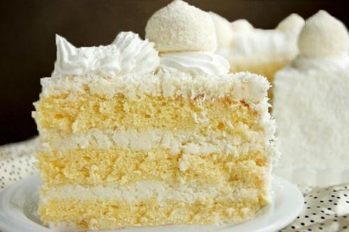 7. намазала два коржа. Обмазала бока и верхушку. Обсыпала кокосовой стружкой. Для украшения я белые кокосовые маршмеллоу использовала.