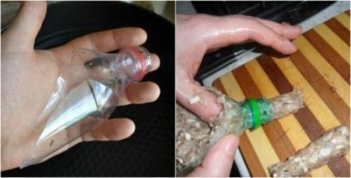 Шаг 2 формируем колбаски: фарш пропускаем через обрезанное горлышко пластиковой бутылки.