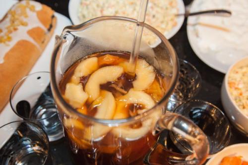 В горячую воду положить сахар, растворить его. Поставить на огонь и довести до кипения, затем положить фрукты и пряности. Еще раз довести до кипения, проварить в течение минуты, а затем снять с огня и остудить.