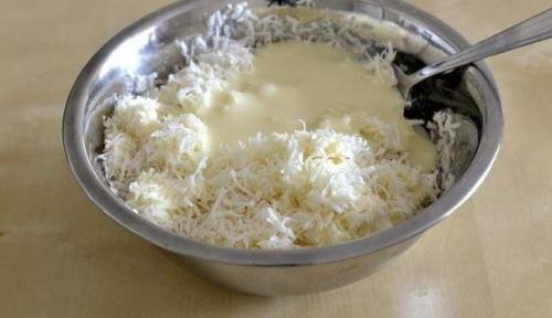 1. смешать хорошенечко сгущенное молоко с кокосовой стружкой.