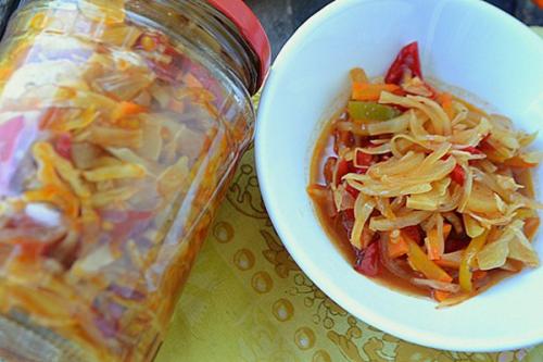 Все овощи необходимо нарезать мелкой соломкой. Затем в них следует добавить сахар, соль, уксус, красный и черный перец, приправы.