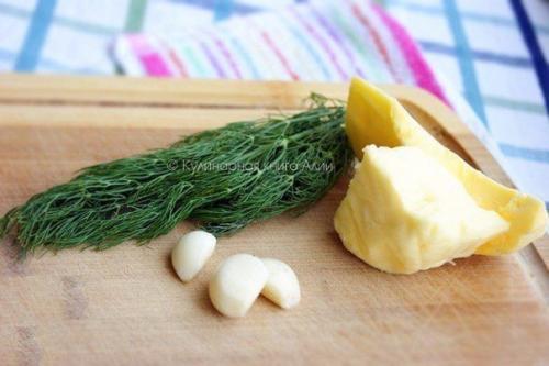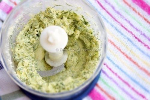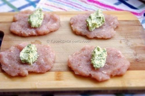 Сначала мы сделаем начинку. Для этого потребуется слив. Масло, укроп и чеснок. Укропа и чеснока возьмите по вкусу. Можно все мелко порезать и смешать с маслом, а я все смешала в блендере. Уберем пока в морозилку и займемся фаршем. В готовый куриный фарш соль и перец по вкусу добавить. Хорошо вымешать. Разделить фарш на десять кусочков, сделать из них колобки, затем расплющить их в лепешечки (руки смочите водой, чтобы фарш не лип. На каждую лепешечку положить по ложечке начинки. Кстати, в качестве начинки можно использовать и сыр, и грибы. Смоченными руками сформировать котлетки. Теперь панировка. Панировка должна быть толстой, поэтому.