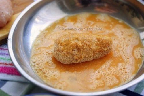 Сначала котлетку обваляем в муке. Затем в чуть подсоленном взбитом яйце. Затем в сухарях. Опять в яйце.