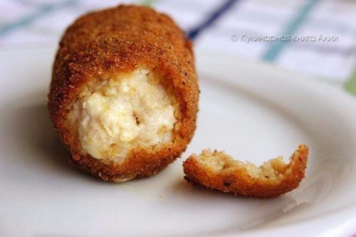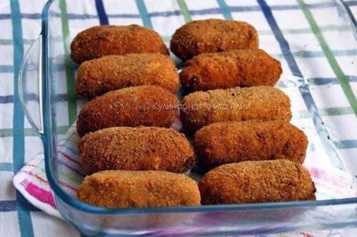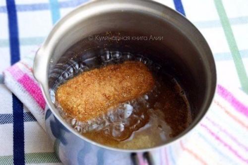 И в заключении - в сухарях. Вот теперь у нас получилась толстая - толстая панировка и начинка уже не вытечет. Теперь кои нужно быстро обжарить в разогретом растительном масле. Я жарила в таком небольшом ковшике, так масло экономнее расходуется. Обжаренные котлетки положить в форму и запечь в разогретой до 180 с духовке минут 15. Вот такие на вид получились, а какой от них исходил аромат - передать не могу. Подавать лучше всего, на мой вкус, с картофельным пюре и салатом.