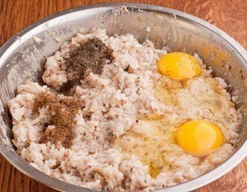 В фарш для котлет вбиваем 2 яйца и высыпаем черный и душистый молотый перец. Все вымешиваем.