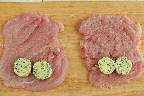 На на край Филе выложить кусочки подмороженного сливочного масла. Филе таким образом, чтобы масло было внутри.