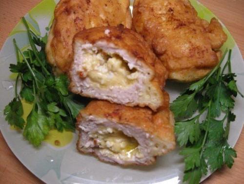 Из фарша делаем лепешечку, кладем начинку, обмакиваем в кляр и мы жарим в сковороде на разогретом растительном масле до готовности.
