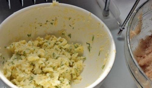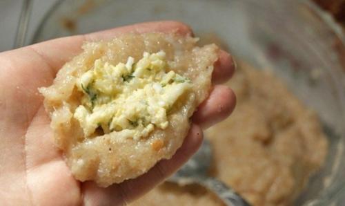2. руки намочите в воде, наберите ложкой фарш, сделайте в середине углубление и положите туда начинку.