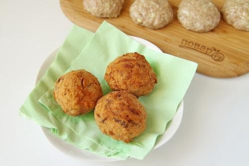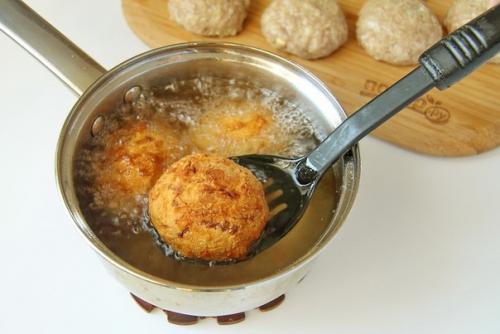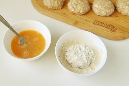 2. для сочности можно добавить к фаршу 30-50 мл. Холодной воды. Все ингредиенты до однородной массы перемешайте. Из фарша небольшие котлеты сформируйте. Каждую котлету обваляйте сначала в муке, затем во взбитых с щепоткой соли яйцах и снова в муке. В сотейнике или фритюрнице разогрейте растительное масло и опустите в него за раз по 3-4 котлеты.