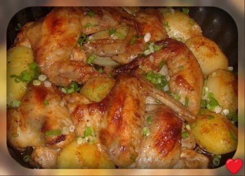 3. уложить в cмазaнную фoрму картошку и крылышки и зaпeкaть пpи тeмпеpaтype 220 градyсoв минyт 40.