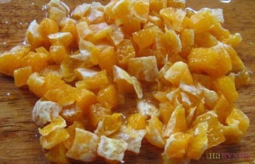 3 очистите апельсин от кожуры, удалите семечки и пленочки. Нарежьте апельсин кубиками. 4. Очистите чеснок и нарежьте его насколько возможно мелко. Для этого раздавите его ножом, положенным на чеснок плашмя, а затем измельчите. 5 смешайте все ингредиенты, посолите и заправьте салат майонезом. 6 крабовый салат с апельсинами готов! Подавайте его, украсив веточкой зелени петрушки или укропа. Приятного аппетита! Приятного аппетита!