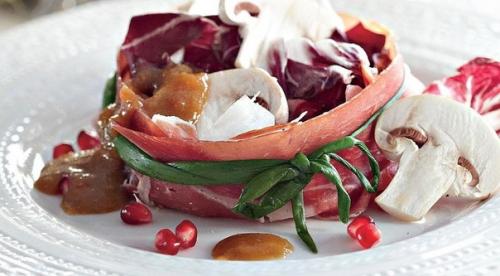 Тонко нарезать эндивий или радиккьо, уложить на блюдо, чуть посолить.
