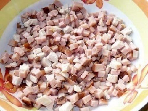 2. затем режим варенное мясо, можно копчёное мясо или колбаску, тоже 1 х 1 см.
