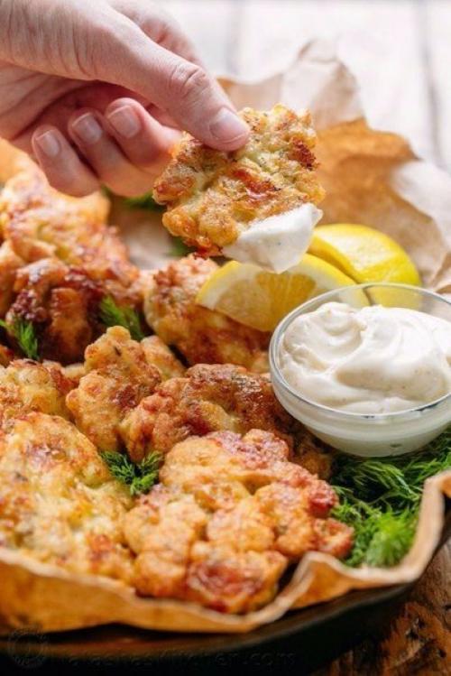 Мы берем острый нож для того чтобы нарезать очень аккуратные и желательно одного размера кусочки куриного Филе. Затем в большой миске смешать все ингредиенты для теста, а это 2 яйца, майонез, 1/3 чашки муки, 1 1/3 чашки тертого сыра, 1 1/2 столовых ложки мелко нарезанного укропа, 1/2 чайной ложки соли и 1/8 чайной ложки молотого черного перца. Перемешать нужно все это очень тщательно, чтобы не было мучных комочков. После этого выкладываем в приготовленную смесь нарезанные кусочки куриного Филе, и еще раз все перемешиваем, затем накрываем миску полиэтиленовой пленкой и ставим в холодильник не менее чем на 2 часа, а лучше на ночь.